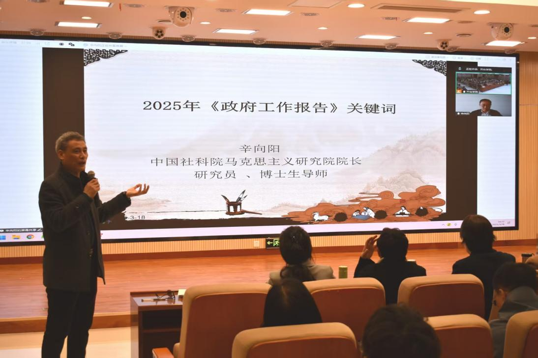 2025年3月18日下午,马克思主义学院举办了第62期社科讲坛。本次讲坛特邀中国社会科学院马克思主义研究院院长、中国社会科学院大学马克思主义学院院长,二级研究员、博士生导师、第十四届全国人大代表辛向阳研究员,通过线上方式在图书馆报告厅为马克思主义学院170名师生作《2025年政府工作报告关键词》主题报告,报告会由院长张兆平主持。 本次报告会辛向阳研究员以九个关键词为切入点,深度剖析2025年政府工作报告。他先从“稳、进、...