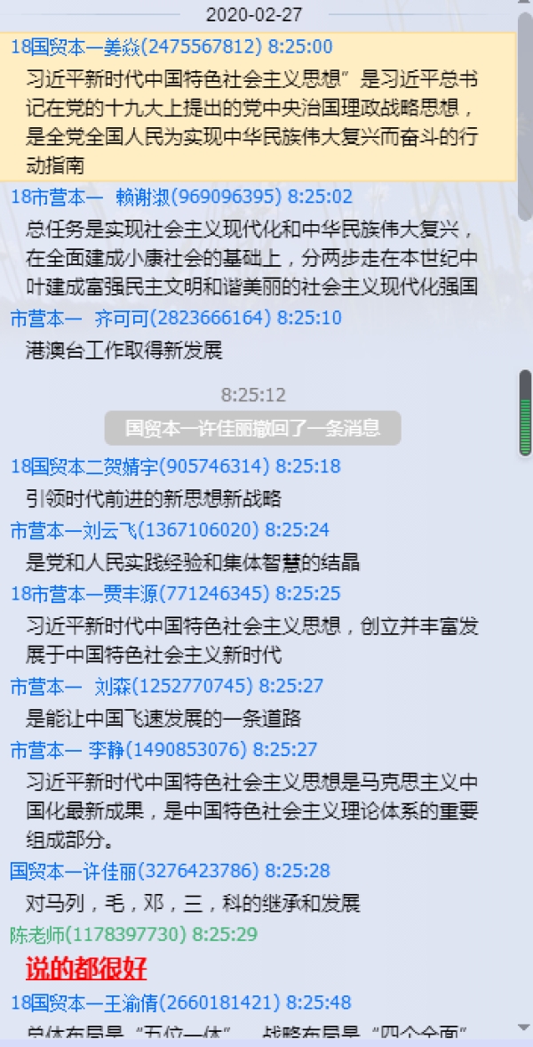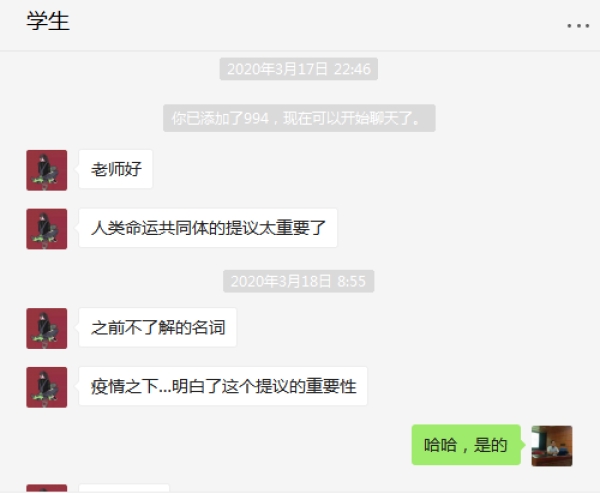 通过各种形式的在线教学,教师和学生都感到大有收获。教师们提高了利用当代先进电子媒体和科技成果进行授课的本领,学生们则体验了一种特殊的空中课堂。但无论是教师还是学生,都在对中国爆发严重疫情的的切身体验中,都在对党领导下我国全民抗击疫情的人民战争中,都在我国疫情得到了有效控制的喜悦中,都在现在仍然处于对世界各国疫情的极大关注中,感受到了中国特色社会社会主义的制度优势,感受到了中国共产党治国理政的人民情怀,感受到了什么是中国共产党的“以人民为中心”的发展思想,什么是“中华民族伟大复兴中国梦”,感受到了我们为什么要建设高度发达的“生态文明”和“美丽中国”,感受到了什么是习近平在总书记倡导的“人类命运共同体”。大家纷纷表示,一定要牢固确立“四个意识”,坚定“四个自信”,切实做到“两个维护”,不忘初心,牢记使命,永远跟党走,把爱国情、强国志、报国行自觉融入坚持和发展中国特色社会主义事业、建设社会主义现代化强国、实现中华民族伟大复兴的奋斗之中。